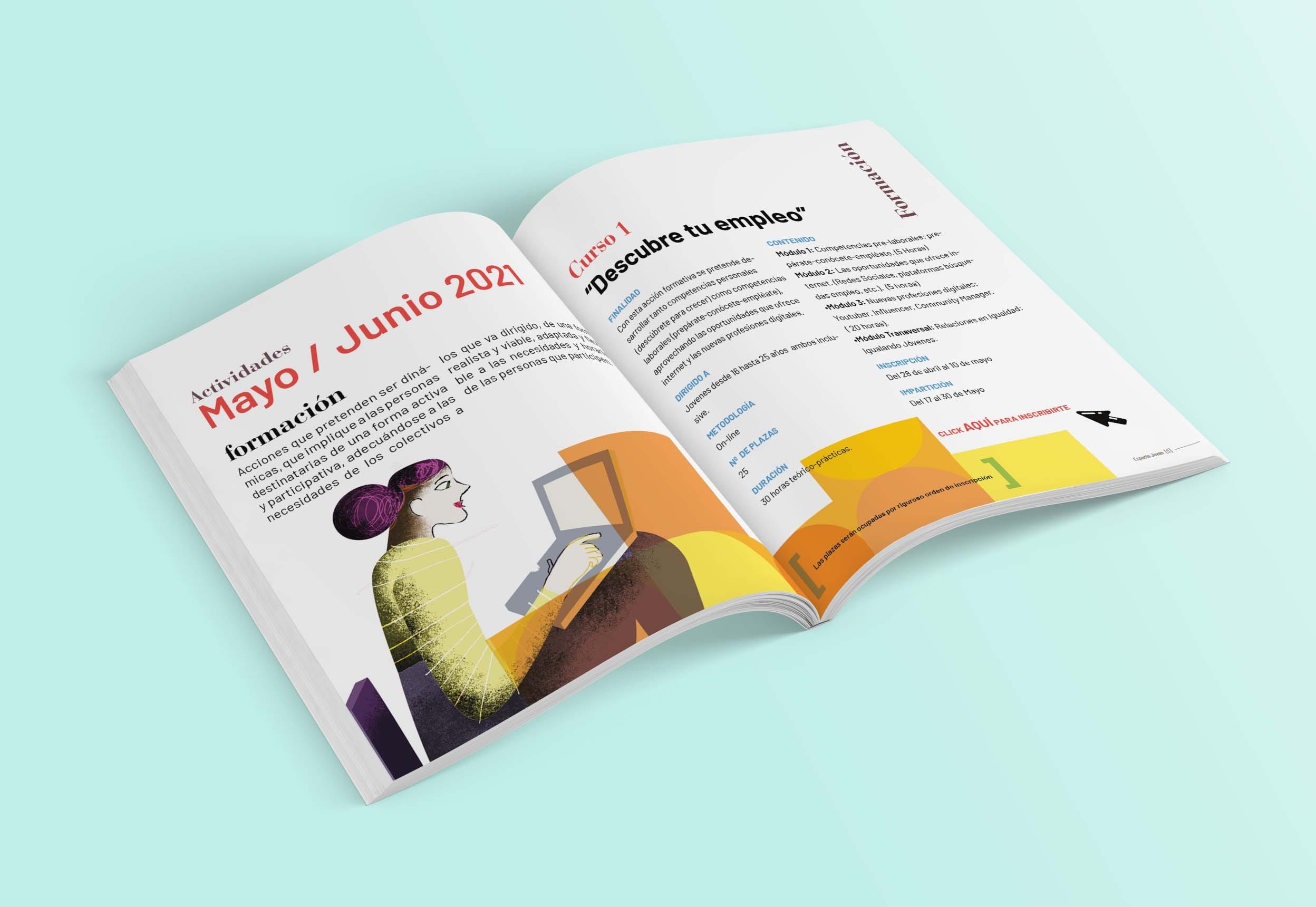 A base de ilustraciones coloristas y vibrantes, realizamos una identidad gráfica atractiva para el público al que va destinada. Susceptible de ser implementada en multiples soportes y elementos que acerquen el conocimiento del programa a los interesados. Las ilustraciones pueden ser utilizadas individualmente, como elemento señalizador de actividades concretas o parte del material gráfico de determinada actividad